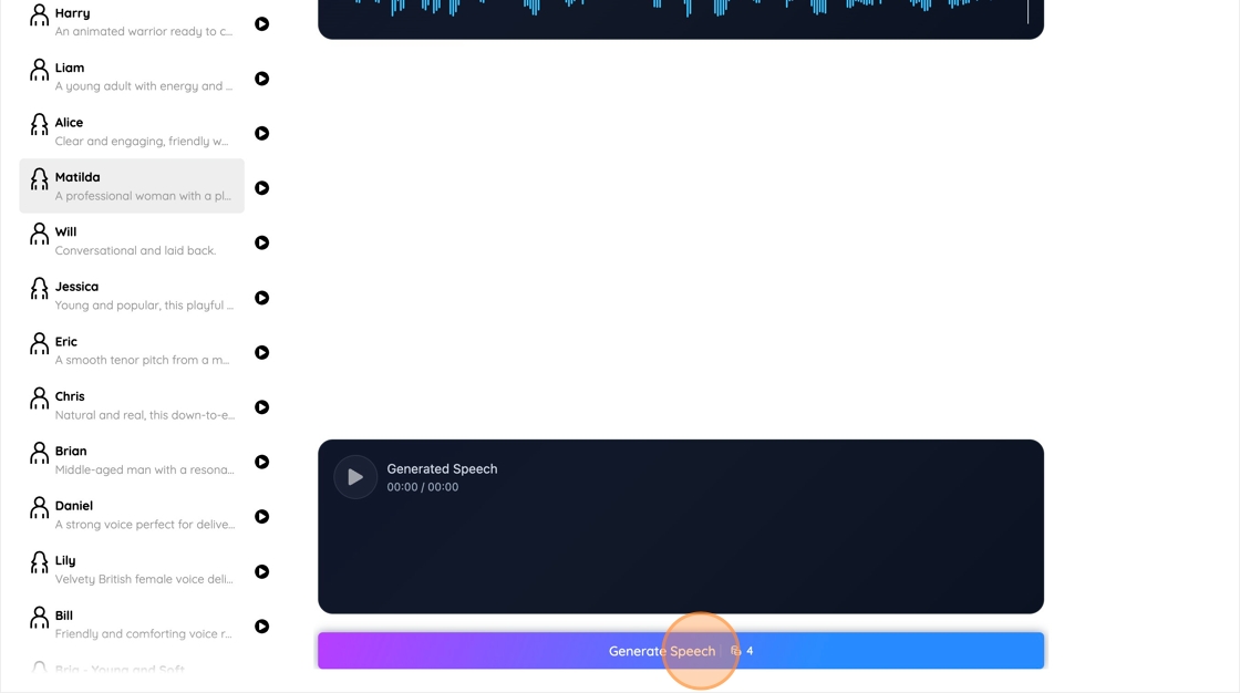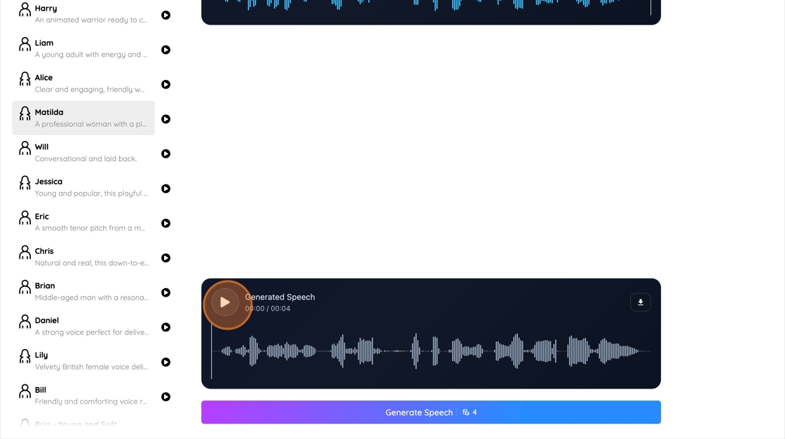 9. Once your speech is generated, click the play button in the audio player at the bottom to preview it.