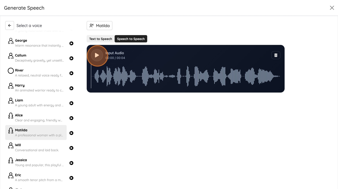 This guide provides a simple and effective approach to transforming existing audio into new speech using AI. It walks you through each step — from selecting a voice to generating and previewing the final output.