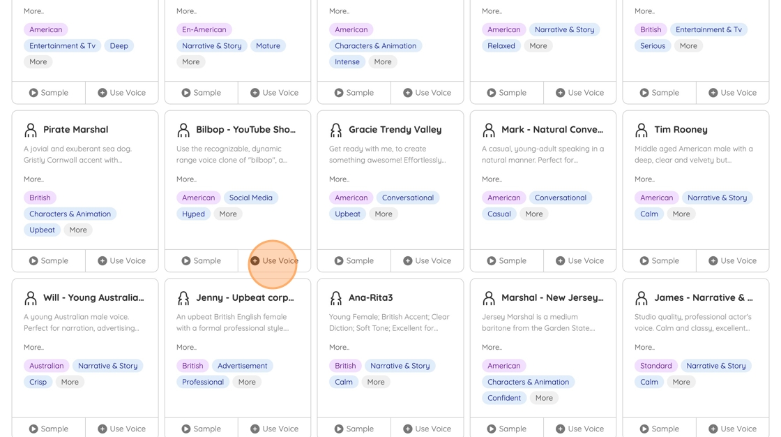 4. You'll see a list of available voices. Click "Sample" next to any voice to hear a preview, then select your preferred one and click "Use Voice."